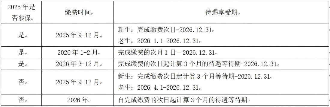 (一)2025级新生在入学时缴费,待遇享受期为完成缴费的次日至2026年12月31日。