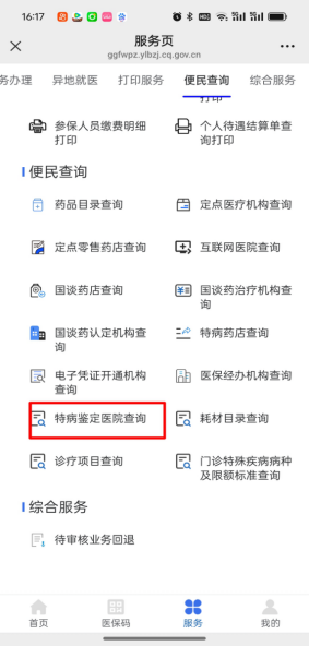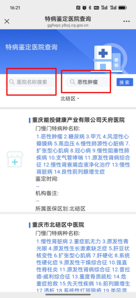 关注“重庆医疗保障局“微信服务号----使用“医保电子凭证登录”----进行“授权查询”------”进入“服务大厅”---进入“服务”---点击“便民查询”----“特病鉴定医院查询”----选择“北碚区”----点击“疾病名称”或者“医院名称”进行搜索