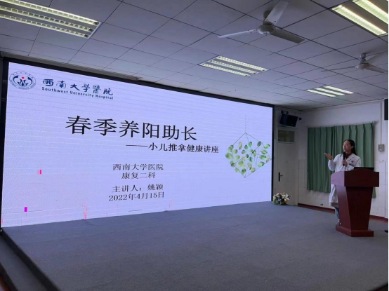 为普及日常幼儿护理推拿方法,让更多的老师、家长了解中医保健、治疗的精妙,让幼儿受益于小儿推拿。4月15日,我院康复二科赴西南大学附属幼儿园(南区)开展“守护幼儿春季养阳助长--小儿推拿”公益讲堂活动。