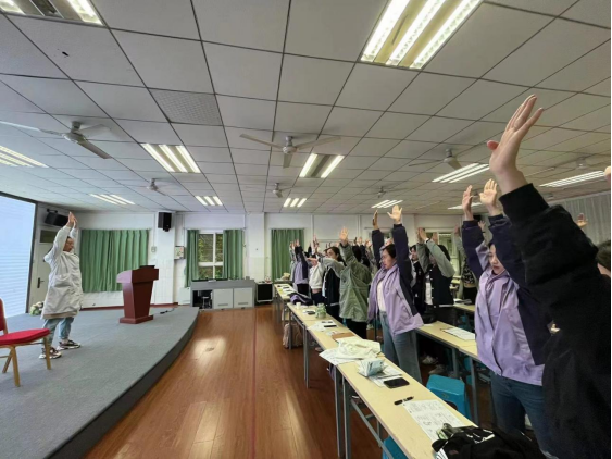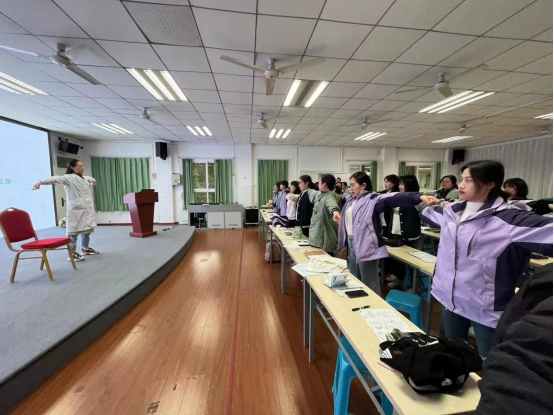 在互动环节中,姚颖对现场老师、家长提出的问题进行了细致的解答,并针对老师们常见的颈肩不适情况制定了一套治疗方案。她围绕颈肩如何自我评估、分析疼痛原因、避免错误体态以及预防颈肩损伤等方面进行了讲解,最后为大家教学了一套简单、易学、高效的工间操,帮助大家缓解颈肩不适。
