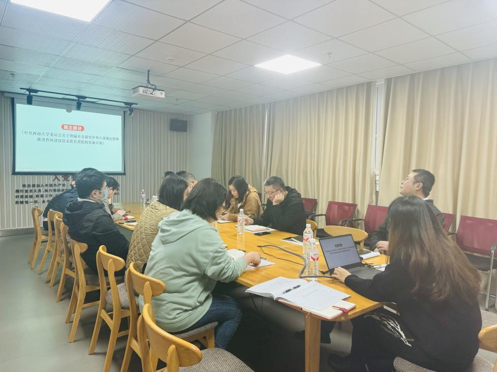 活动伊始,查静思同志带领支部全体党员深入学习习近平总书记在党的二十届四中全会上的重要讲话和全会精神,学习习近平总书记给中国农业大学全体师生的回信,并研读了《中共西南大学委员会关于锲而不舍落实中央八项规定精神推进作风建设常态化长效化的实施方案》。通过学习,全体人员深刻领会了“十五五”时期国家发展的战略方向与根本要求。