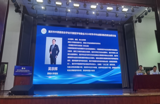 5月17日-19日,重庆市中西医结合学会在武警重庆总队医院召开重庆市中西医结合学会灾害医学专委会2024年学术年会暨训练伤防治研讨会。大会围绕中西医结合急危重症院前急救、伤员转运和后续治疗的新理念、新模式、新装备、新疗法进行深入讨论和交流,并对严重创伤早期救治、后续并发症及训练伤防治的国内外新进展进行学术交流,为我市急危重症救治事业的发展做出贡献。西南大学医院党委书记,西南大学运动康复研究所所长吴宗辉受邀参加此次论坛并作主题发言。