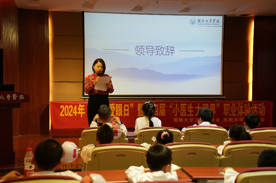活动现场,副院长(主持工作)游莉介绍到,医院长期致力于为师生做实事,为师生提供优质、高效的医疗服务。希望通过“小医生 大眼界”职业体验活动,加强青少年爱眼意识,丰富青少年卫生保健常识,使他们真正从内心去主动纠正不良习惯,爱护好自己的眼睛。