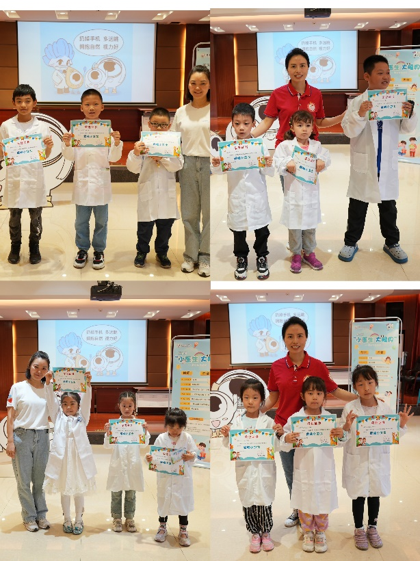 活动中,眼耳鼻咽喉科全体工作人员及部分往届小医生以《阿瞳.目的忏悔书》 漫画配音解说的形式,向小朋友们普及了近视的危险因素、高度近视的危害等科学知识。然后,由眼耳鼻喉科主任陈丹为小朋友们进行了一场生动活泼的眼科科普讲座。从眼球的结构到近视的形成原因、近视的危害到如何预防近视,并提问互动,“小医生”们踊跃参与,积极举手抢答。