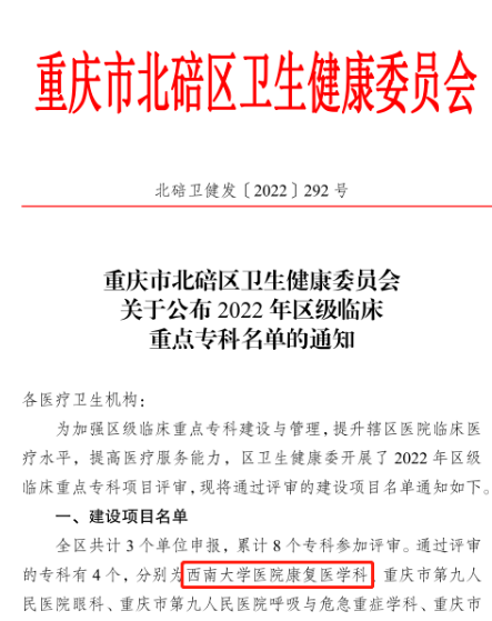 为提升北碚区医院临床医疗水平与服务能力,2022年10月,北碚区卫生健康委员会开展了2022年区级临床重点专科评审项目,遴选产生的可代表区内医疗技术、服务能力和管理水平的优势临床专科,具有医疗服务能力强、技术质量水平高、科研教学能力强等特点,项目建设成功将代表着全区先进医疗技术水平和服务能力。12月27日,区卫健委公布评审结果,我院康复医学科顺利通过评审,成为北碚区2022年临床重点专科。