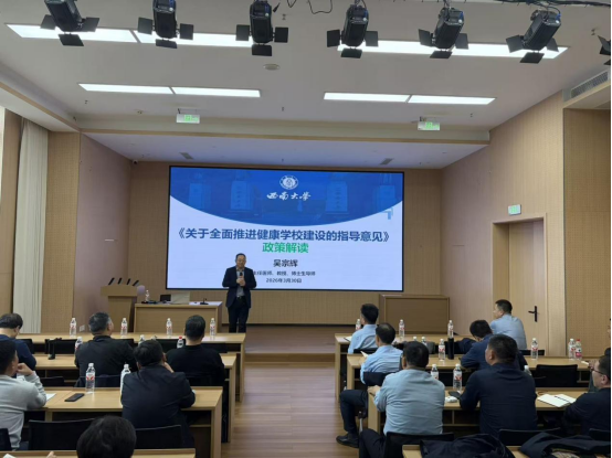 3月30日,西南大学医院党委书记、西南大学运动康复研究所所长吴宗辉受邀为山东省济南市历城区教育系统作健康学校建设专题报告。历城区教委领导及辖区中小学校长一行30人参加培训。此次专题报告聚焦健康学校建设政策落地与实践创新,为基层教育管理工作者传经送宝、赋能增效。